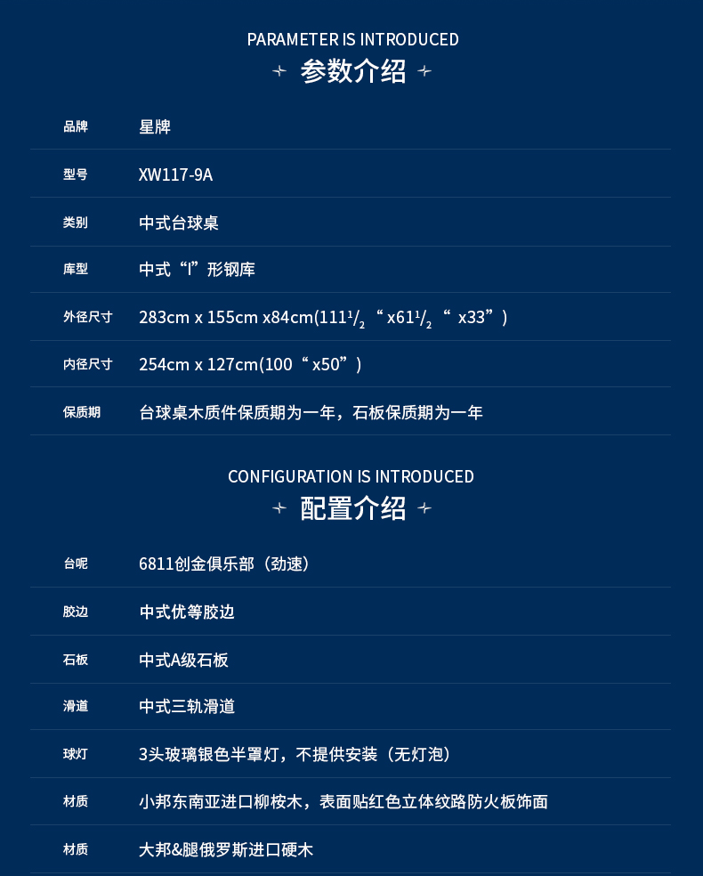 星牌XW117-9A台球桌室内钢库配置中式台球桌