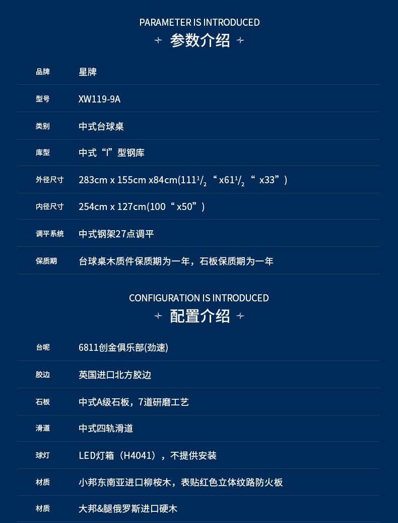 星牌XW119-9A台球桌室内商用专业比赛配置中式台球桌