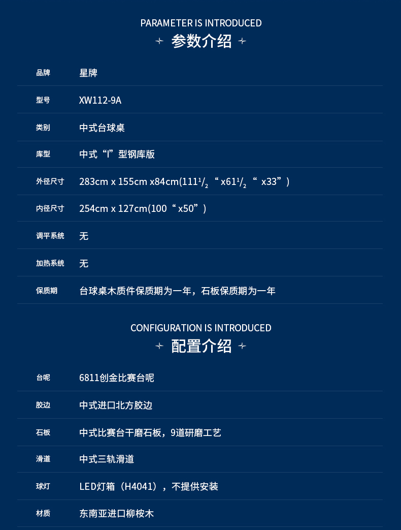 二、星牌XW112-9A台球桌技术参数